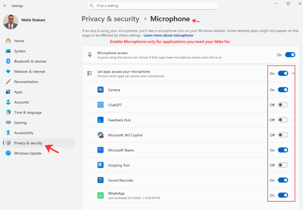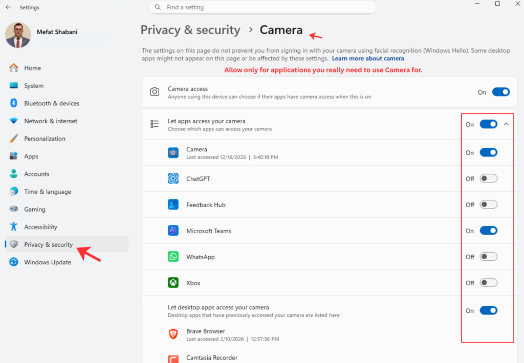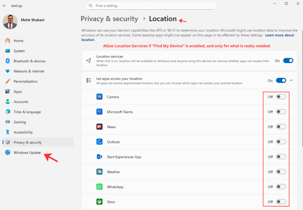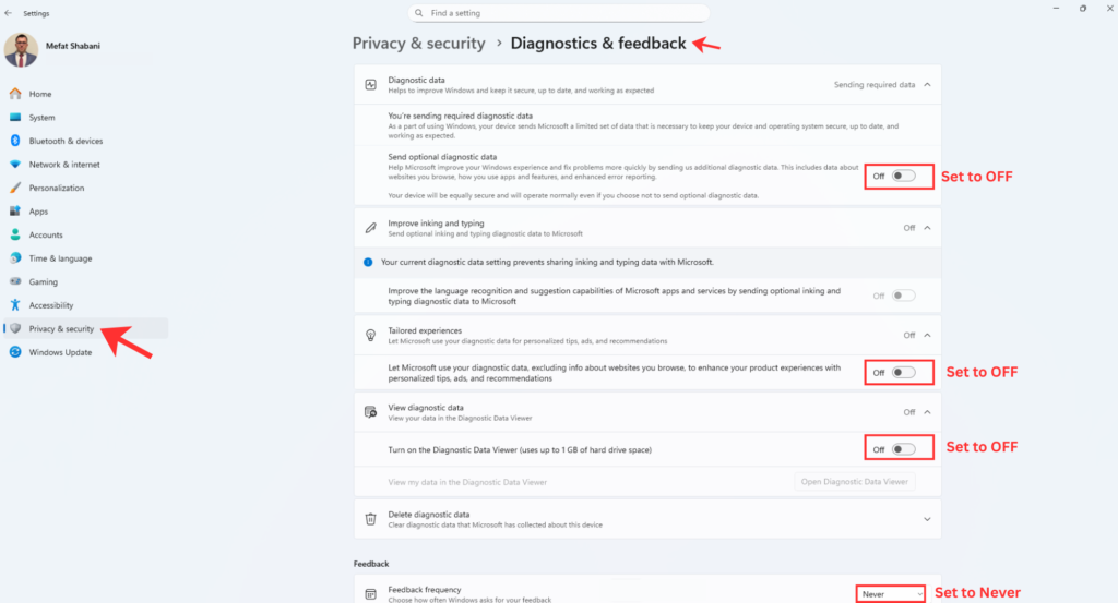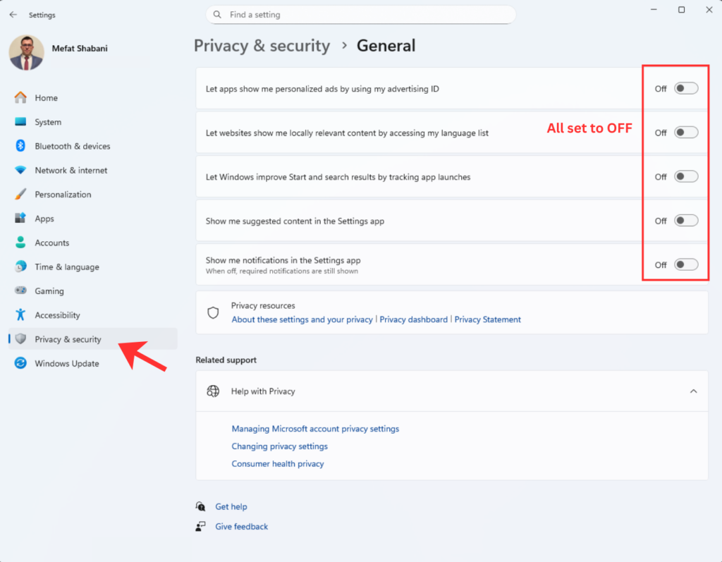 On Windows: Go to Settings, then Privacy & Security, and carefully turn off everything you do not need. Disable advertising ID, location access for apps that do not need it, diagnostic data collection, and all the “improve your experience” options that are really about collecting data.